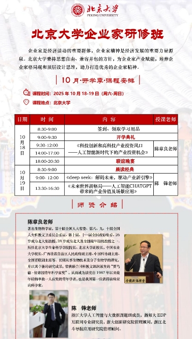 在风云激荡的商业时代,企业家的认知边界决定了企业的发展高度。2026年,北京大学依托百年学术底蕴,为企业掌舵者精心打造了一系列深度与广度并重的研修课程。这些课程不仅传承北大"思想自由、兼容并包"的学术精神,更聚焦新时代企业家的实战需求,构建起一套系统化的赋能体系。